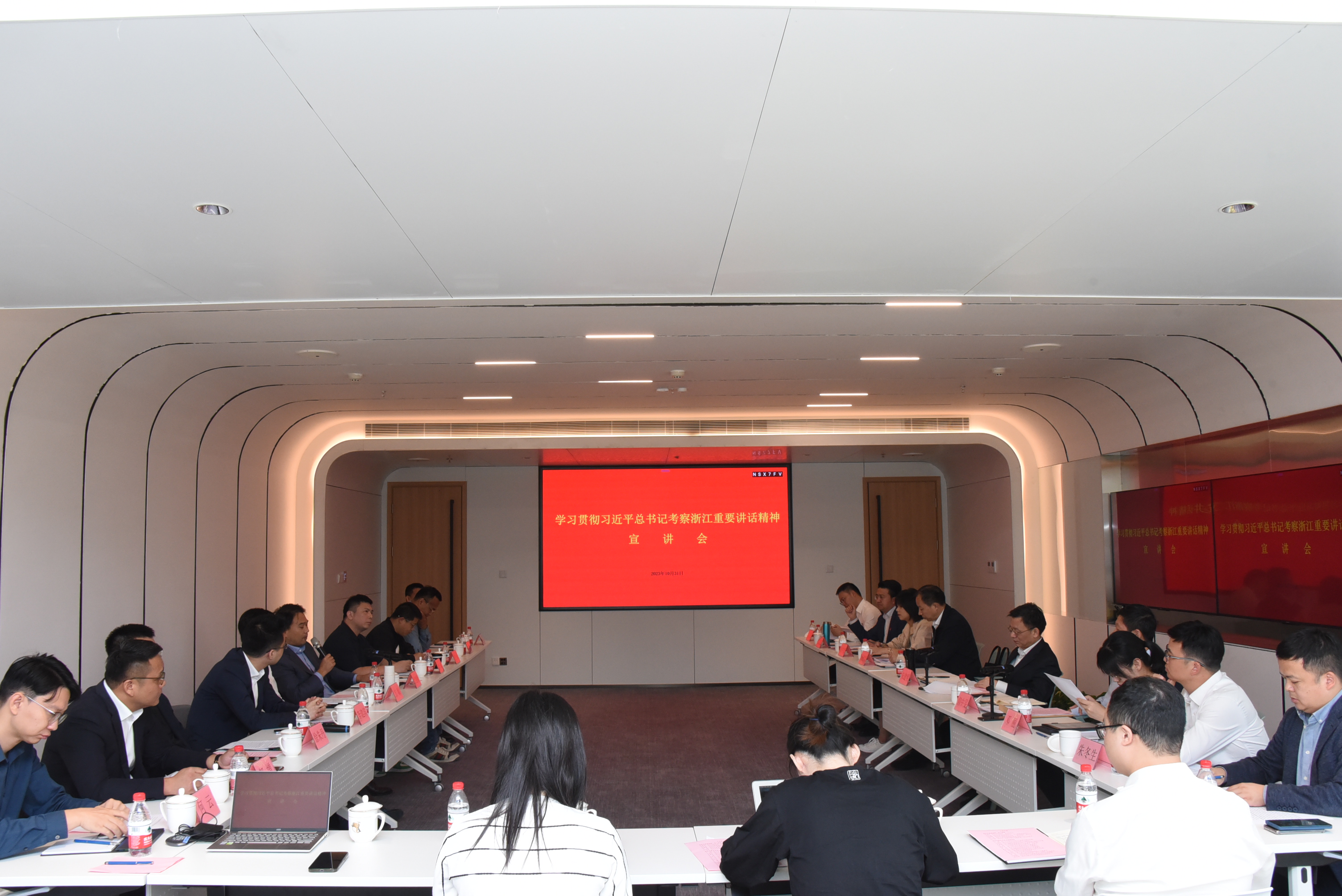 10月31日,由杭州市统战部、市工商联组织的学习贯彻习近平总书记考察浙江重要讲话精神宣讲会在杭召开,杭州市委常委、统战部部长朱建明做主要讲话,市工商联党组书记仰中旻主持宣讲会,铭扬运管集团总裁何云与其他13位新生代企业家代表一同参与会议。