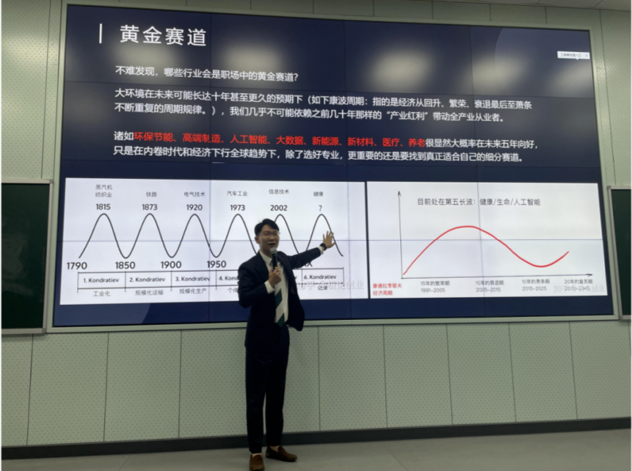 随后,何云老师和同学们分享他对2023年胡润百富榜名单变化的个人理解,指出选择赛道所依靠的多个维度,让学生们充分理解在当前创业赛道选择上所需要的多种准备。