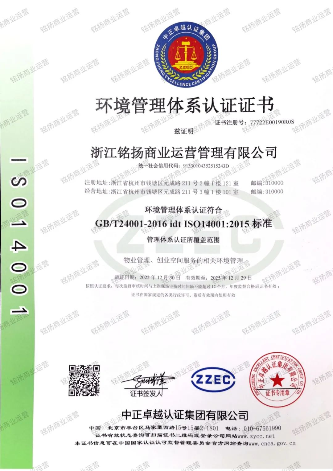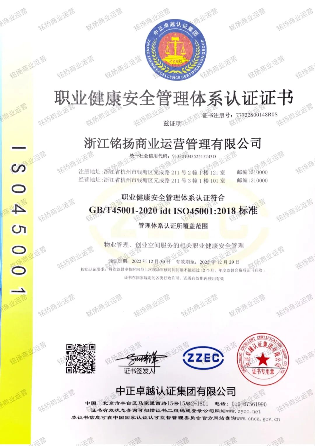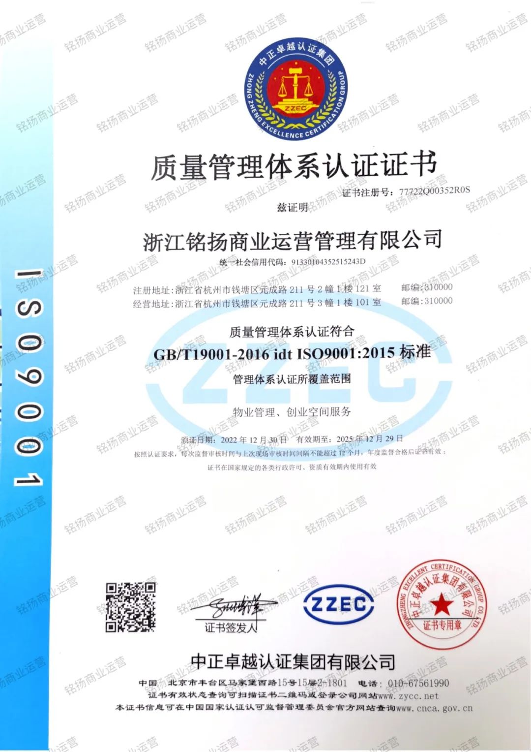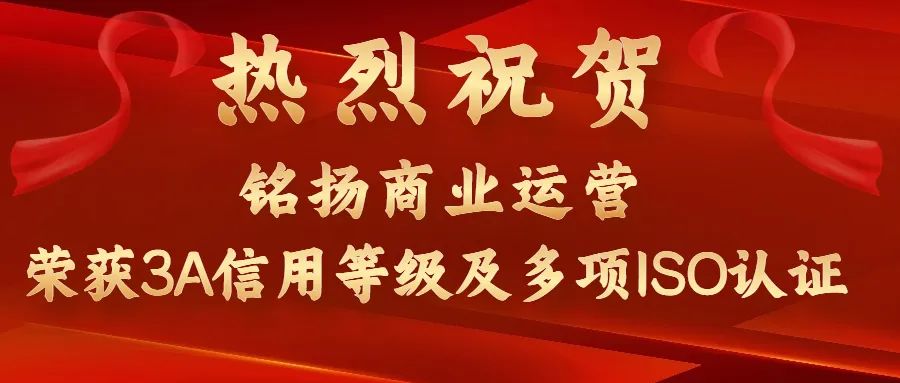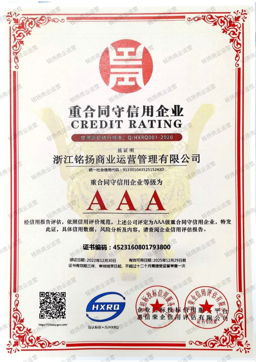 浙江铭扬商业运营管理有限公司经相关部门对信用记录、经营状况和发展前景等综合评定,被评为“AAA级重合同守信企业”荣誉称号,同时获得质量管理体系、职业健康安全管理体系、环境管理体系认证证书,这是对浙江铭扬商业运营管理有限公司的肯定,铭扬运营必不忘初心,坚持服务至上,将铭扬商业运营打造成最具创新竞争力的运营管理平台。
