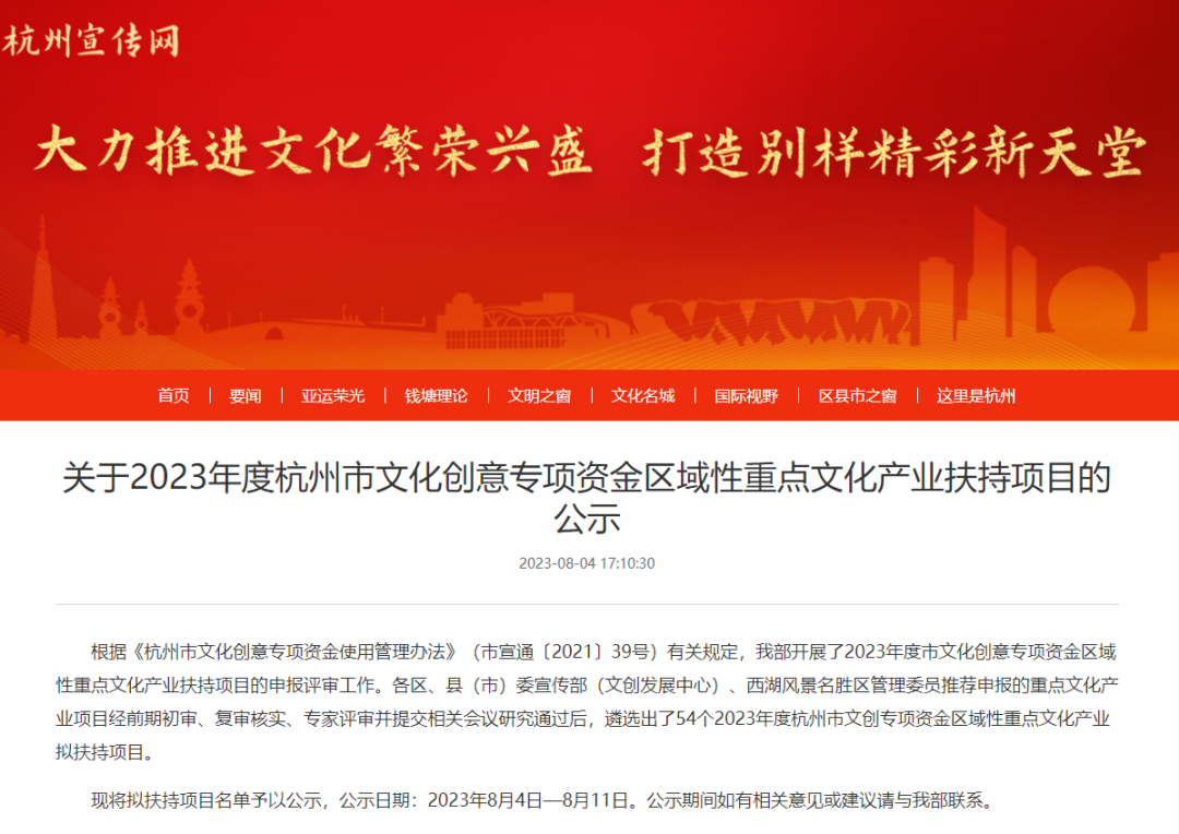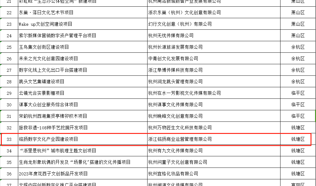 2023年8月4日,铭扬数字文化产业园建设项目入选2023年度杭州市文创专项资金区域性重点文化产业拟扶持项目并予以公示。